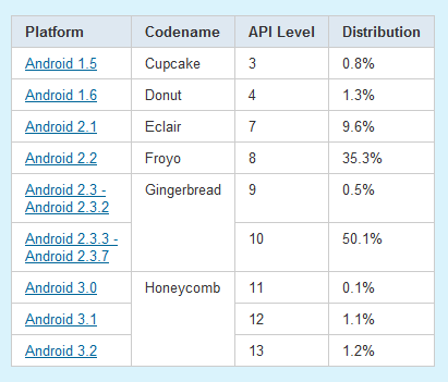 La versiones anteriores, es decir, Cupcake, Donut, Eclair y Froyo van disminuyendo, aunque a un ritmo lento. Por ejemplo, el 35,3% de dispositivos todavía usan Froyo, lo que quiere decir que hay millones de dispositivos ejecutando Android 2.2. En cuanto a las tablets que utilizan Honeycomb, actualmente sólo tenemos el 2,4%. Un número pequeño pero que continua subiendo poco a poco.