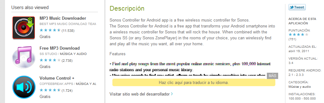 Cuando pulsamos en una aplicación, tenemos más información sobre ella (incluso la posibilidad de traducir automáticamente la descripción de la Aplicación), mostrando listas LO QUE OTROS TAMBIÉN HAN VISTO, LO QUE OTROS TAMBIÉN HAN INSTALADO mostrando aplicaciones similares.