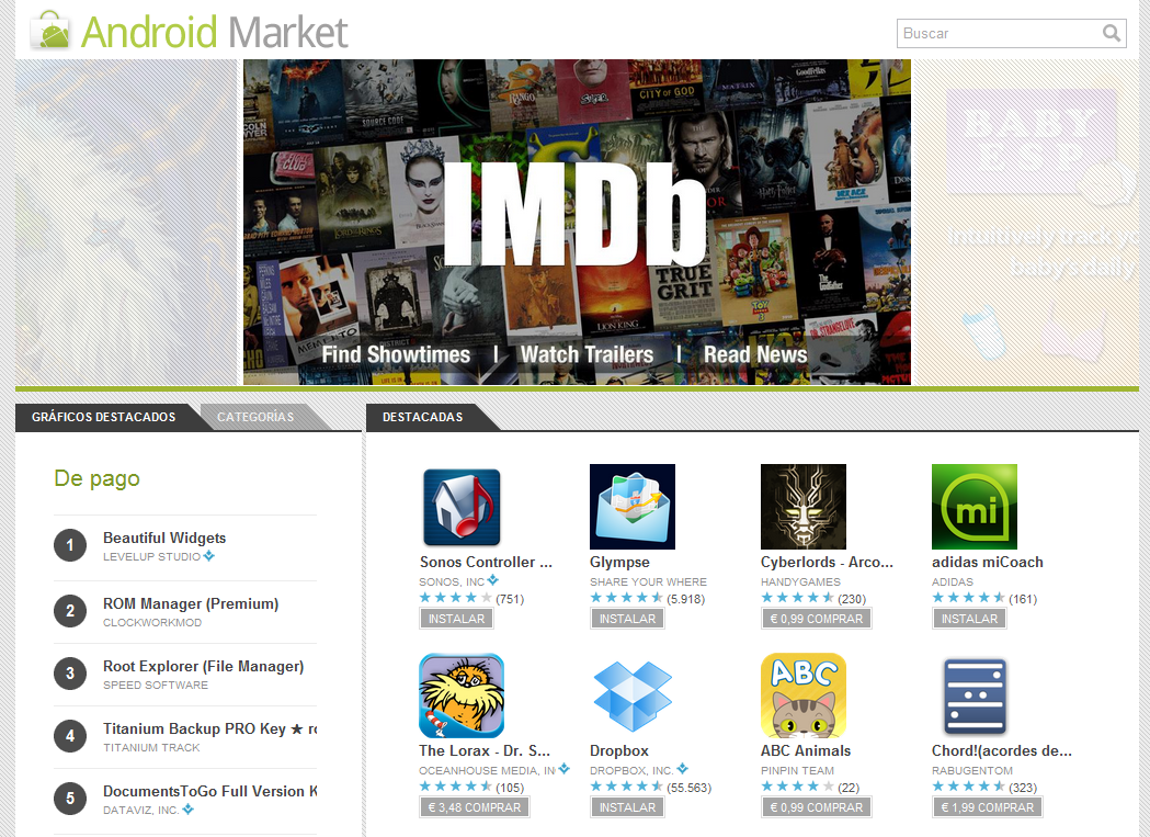 Las mejoras que podemos ver nada más entrar al market es que hay un montón de nuevas listas de aplicaciones de diferentes categorías que nos ayudarán a seleccionar mejor la aplicación que deseemos. Ahora tenemos listas DE PAGO, GRATUITAS, MAS DESCARGADAS, NUEVAS DE PAGO, NUEVAS GRATUITAS y la lista de destacadas.